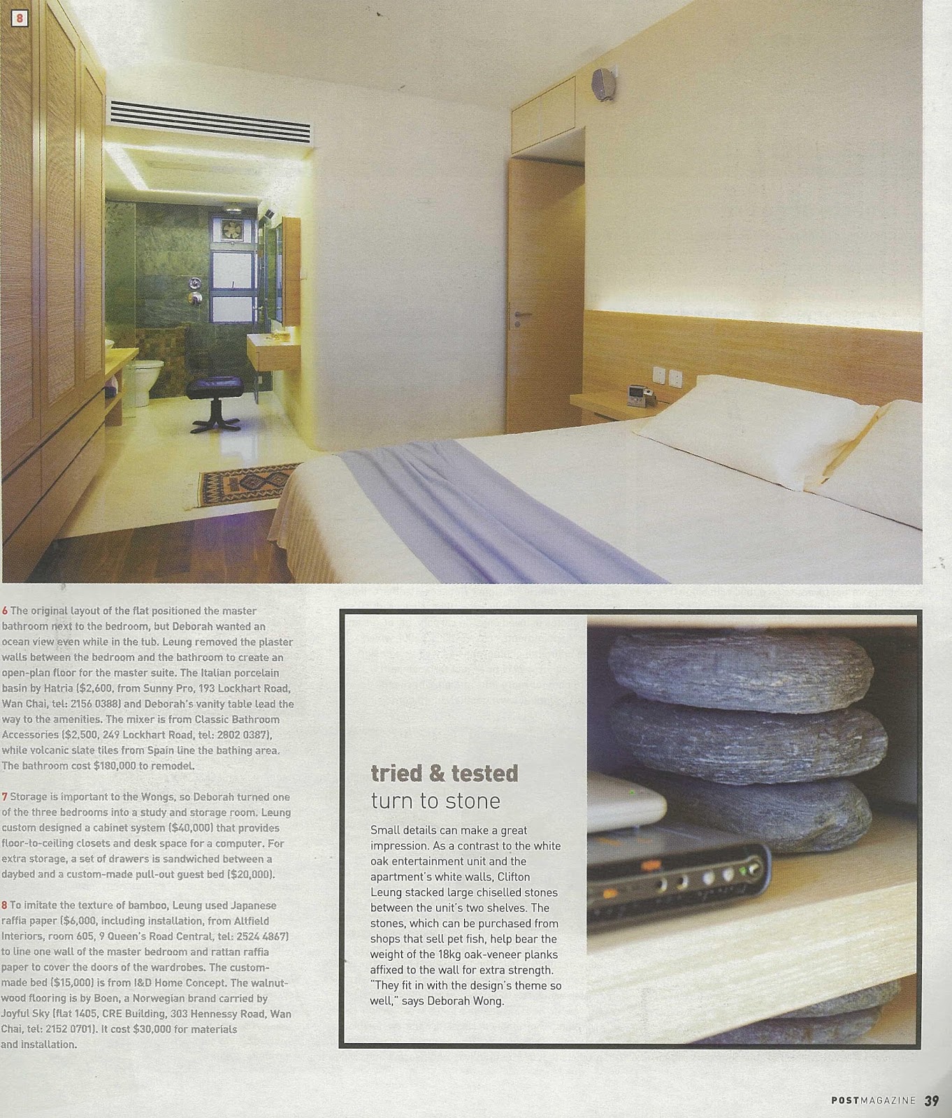 As the apartment has an outstanding habour view, a metropolitan pad that is entirely partitioned by a huge transparent glass with minimal borders can capture the panoramic view from all angles. Moreover, the feature stone wall is kept as the only structured wall that divide the bathroom with the bedroom within the entire apartment. This open- design concept connects various living areas and creates a huge spacious home environment that owner enjoy living in. The huge open space can also host a wide range of home entertaining activities as various appliances including Bang & Olufsen audio products and wine cellar from Liebherr are well equipped.